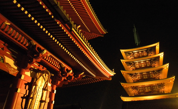 平公雅(たいらのきんまさ)が建立したと言われている東京都内では最古の寺、浅草寺。たび重なる焼失により本堂や五重塔を失ったが、そのたびに再建され現在に至る。徳川家光の援助により1648年に再建されたが第二次世界大戦時の東京大空襲により焼失、その後1973年に現在の場所に再建された。基礎部分となる基壇の高さは約5メートル、塔自体の高さは約48メートルである。現在の搭最上層には世界文化遺産に登録されている、スリランカ・アヌラダープラのイスルムニヤ寺院から招来した仏舎利が安置されている。